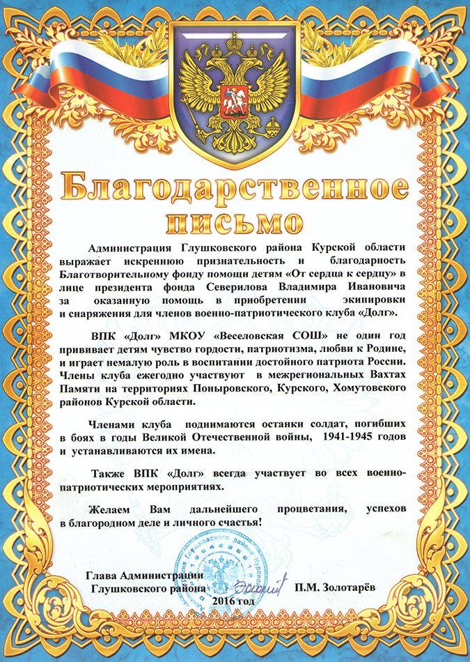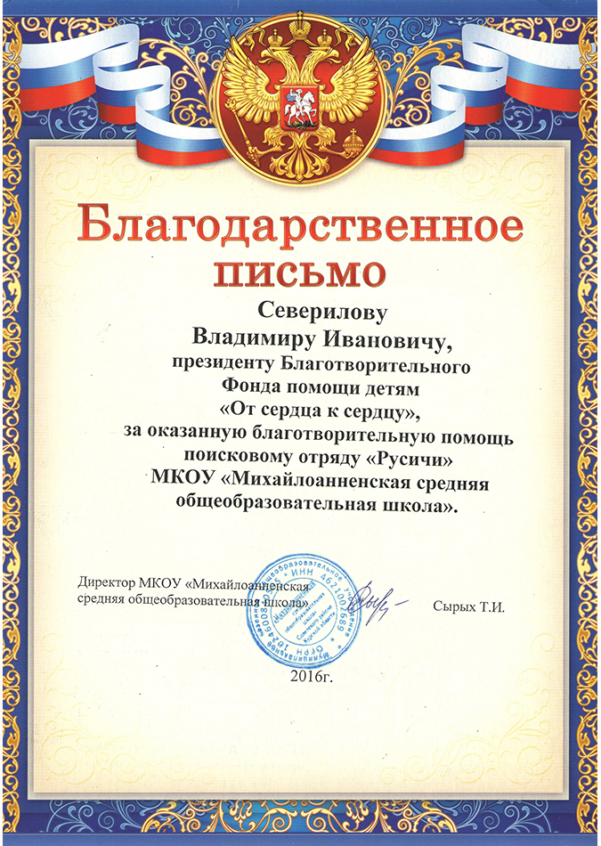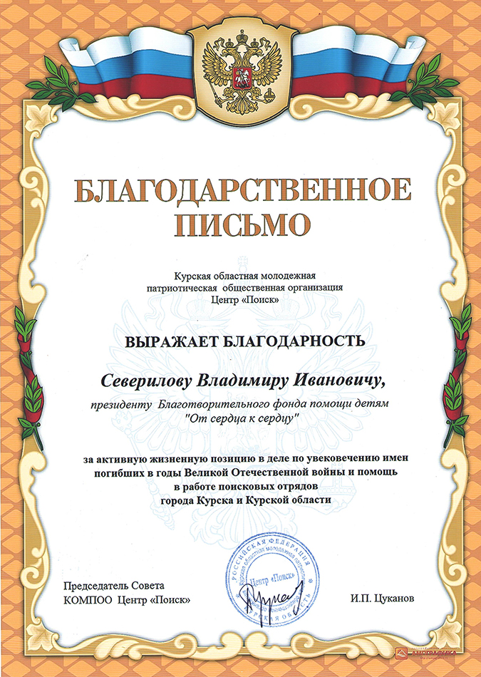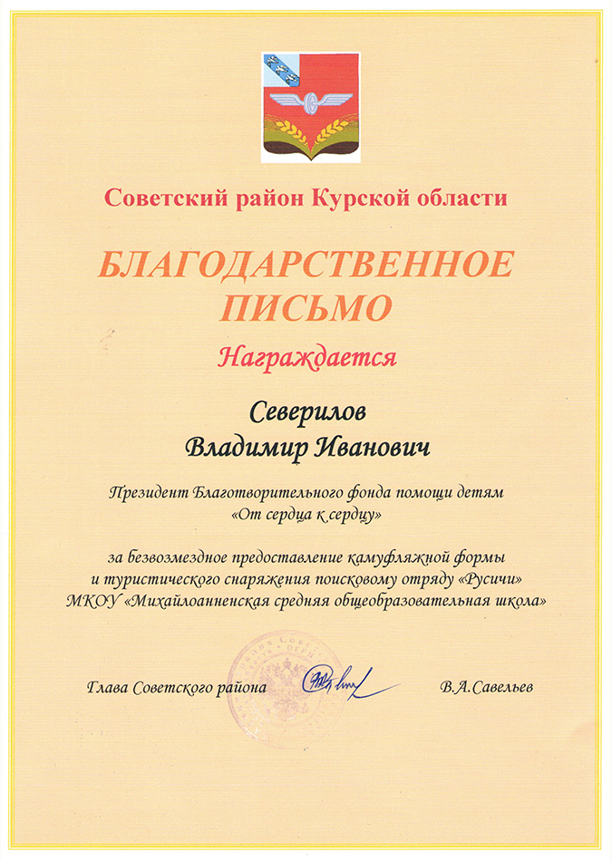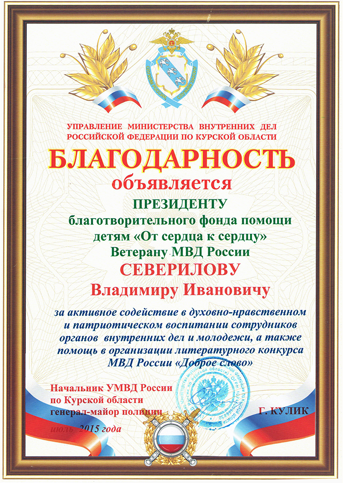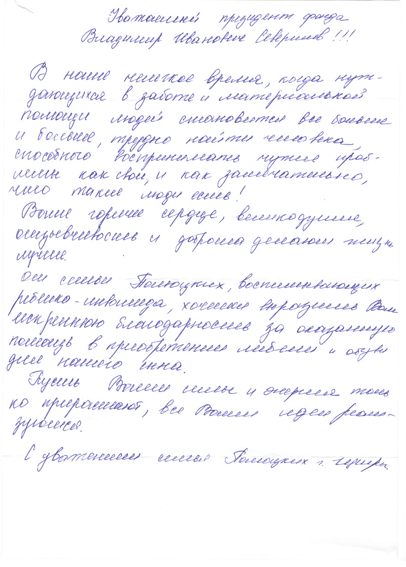 Отдельные слова благодарности хотим сказать Северилову Владимиру Ивановичу!!!! Это чуткий, отзывчивый, понимающий чужую беду-человек!!! Владимир Иванович отнёсся к чужому горю,как своему собственному и помог нам решить одну из проблем с обеспечением нашей дочки лекарственными препаратами!!! Проявил чуткость, заботу и внимание по отношению к нам!!!!!!!