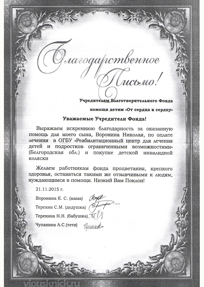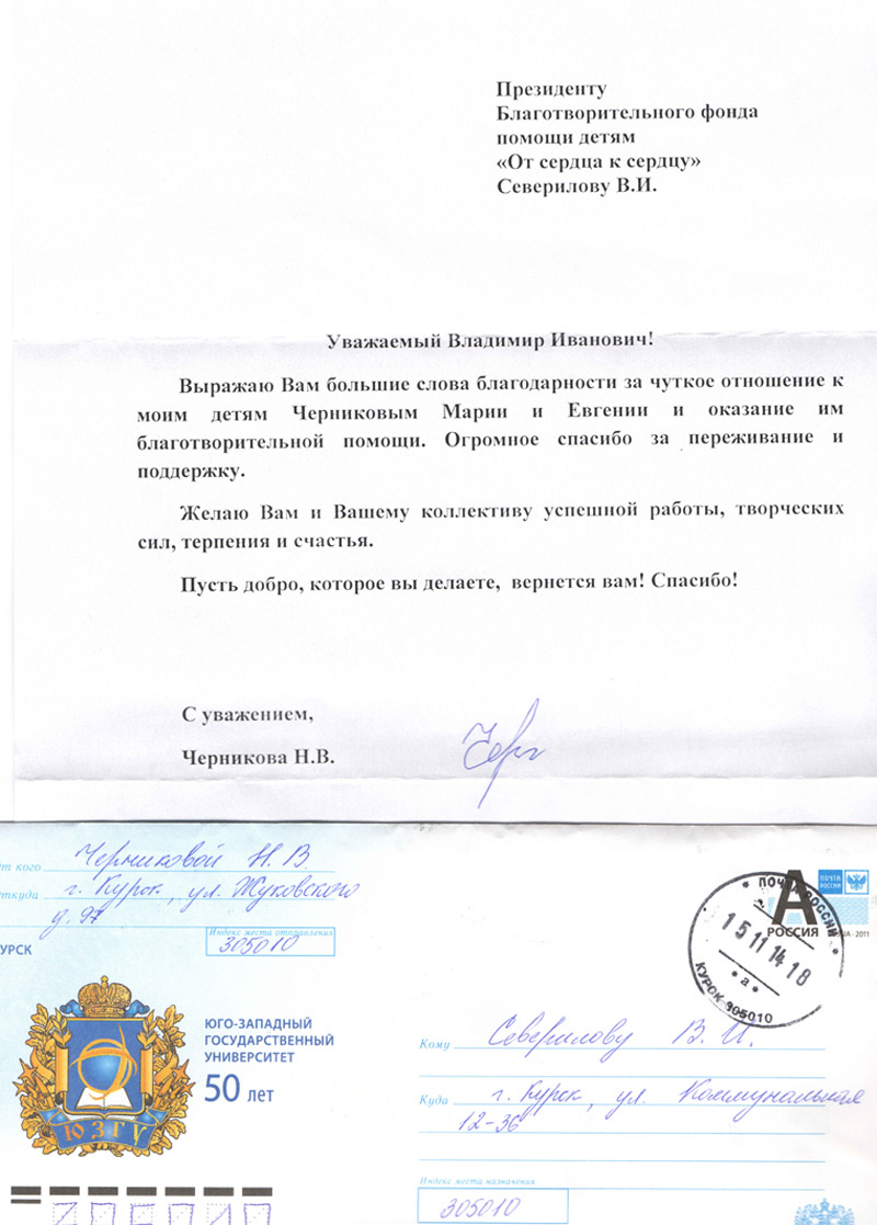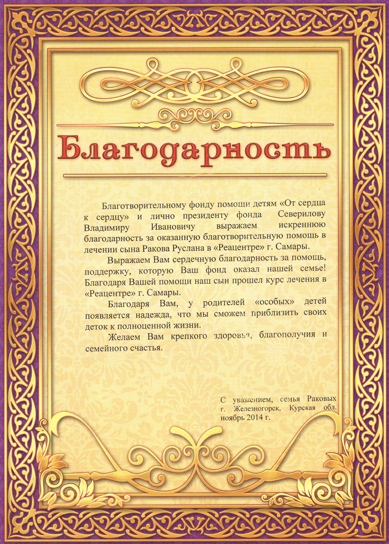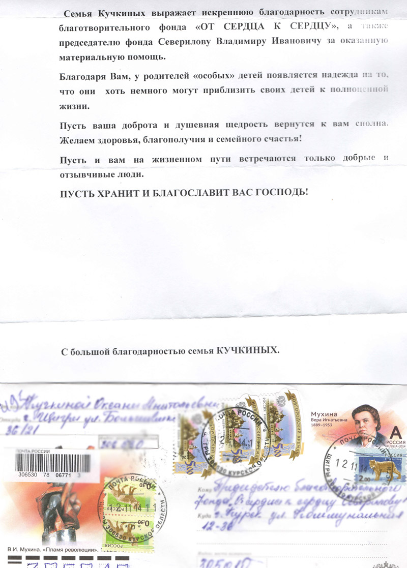 Уважаемые руководители фонда "От сердца к сердцу"!Вся наша семья от всей души благодарит Вас за оказанную помощь нашей дочери Кинаш Олесе!!!!